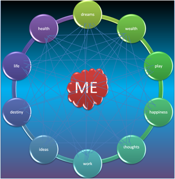 I’m in the centre, and everything else that I’ve experienced / am experiencing / will experience is linked to me and surrounding me, and they in turn are branching out into other areas, and linking between themselves in a random fashion. And that is where the flowing comes in, a natural progression outward and inward of my thoughts and events, and everything is linked to me. Well, I am at the centre of my universe, so that’s logical.