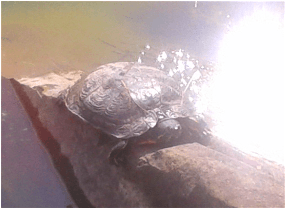 Walking around the lake the other day, I stopped off to have a quick lean against one of the rocks and to watch the fish and the ducks swimming. I’d been leaning for a few minutes when I spotted this chap or chappess basking in the bright sunshine. He (or she!) was not in the least bothered that I was nearby, and allowed me to take a few photos using my handy mobile phone.