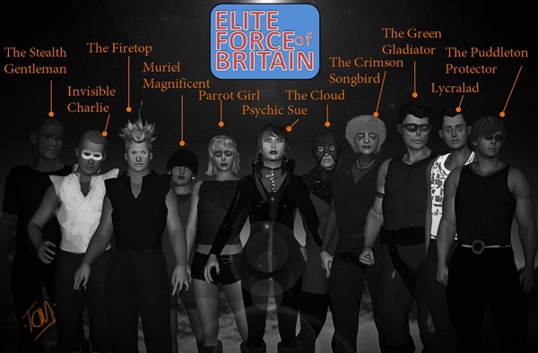 I haven’t posted about the Elite Force of Britain for a while, but they are still there, working hard at being superheroes. Over on Splodge and Splatter, I posted the original to the above image yesterday, but just thought I’d post a quick who’s who.