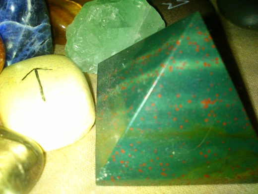 Týr is represented by the Rune Tiwaz, which looks like an arrow pointing upwards. Tiwaz has a parapsychological link to a spiritual warrior, honour and righteousness; it also links in law and justice. Here’s an old photo of my Tiwaz Rune beside my Bloodstone Pyramid: