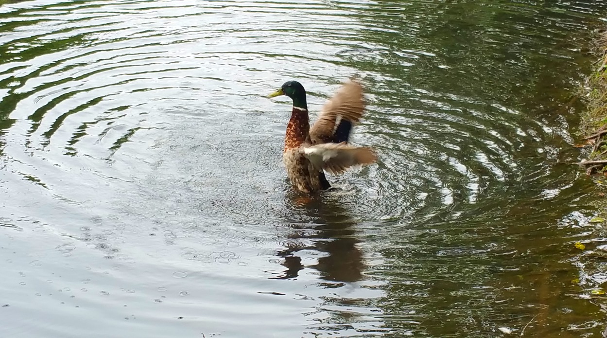 I was meandering arind the Grinds at lunchtime today, and on my circuit of the Lake, I noticed that every duck was out on the water. Bobbing up and down they were, facing this way and that, and seemingly having a wonderful time. Then one of them stood up in the water and started flapping its wings about – either bathing, or cooling down. Then another did it. And then another. I kept my eyes on the duck closest to the bank, and then true enough, it too started this little dance.