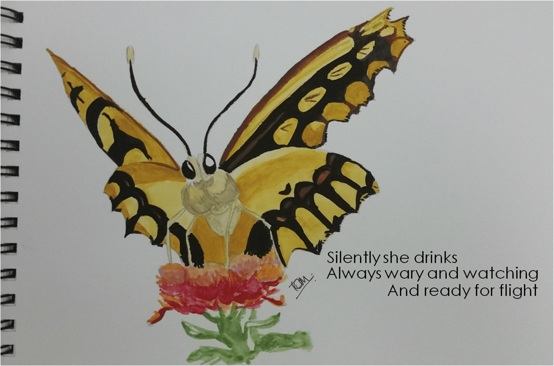 I have no idea what type of butterfly this is… I found the image online, and liked the way it was looking toward the camera. Well, that’s how I saw it, anyway. I always tend to see things just a little differently… and one quick doodle later, followed by a splosh of this colour and a splish of that one, a sprinklin’ of a few words hither and thither, and the addition of my name for good measure, today’s post is complete.
