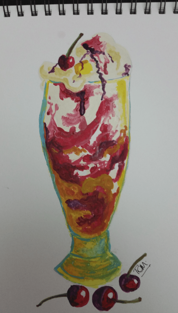Scrumptious vanilla and banana ice cream, blended to perfection with fresh cream, layered in a lopsided glass with strawberry, black cherry and passion fruit sauces, sprinkled on top with one or two crumbled biscuit pieces and a cherry and a chunk of pineapple to top it off. Looks appalling… but looks aren’t everything. It’s what’s inside that matters.