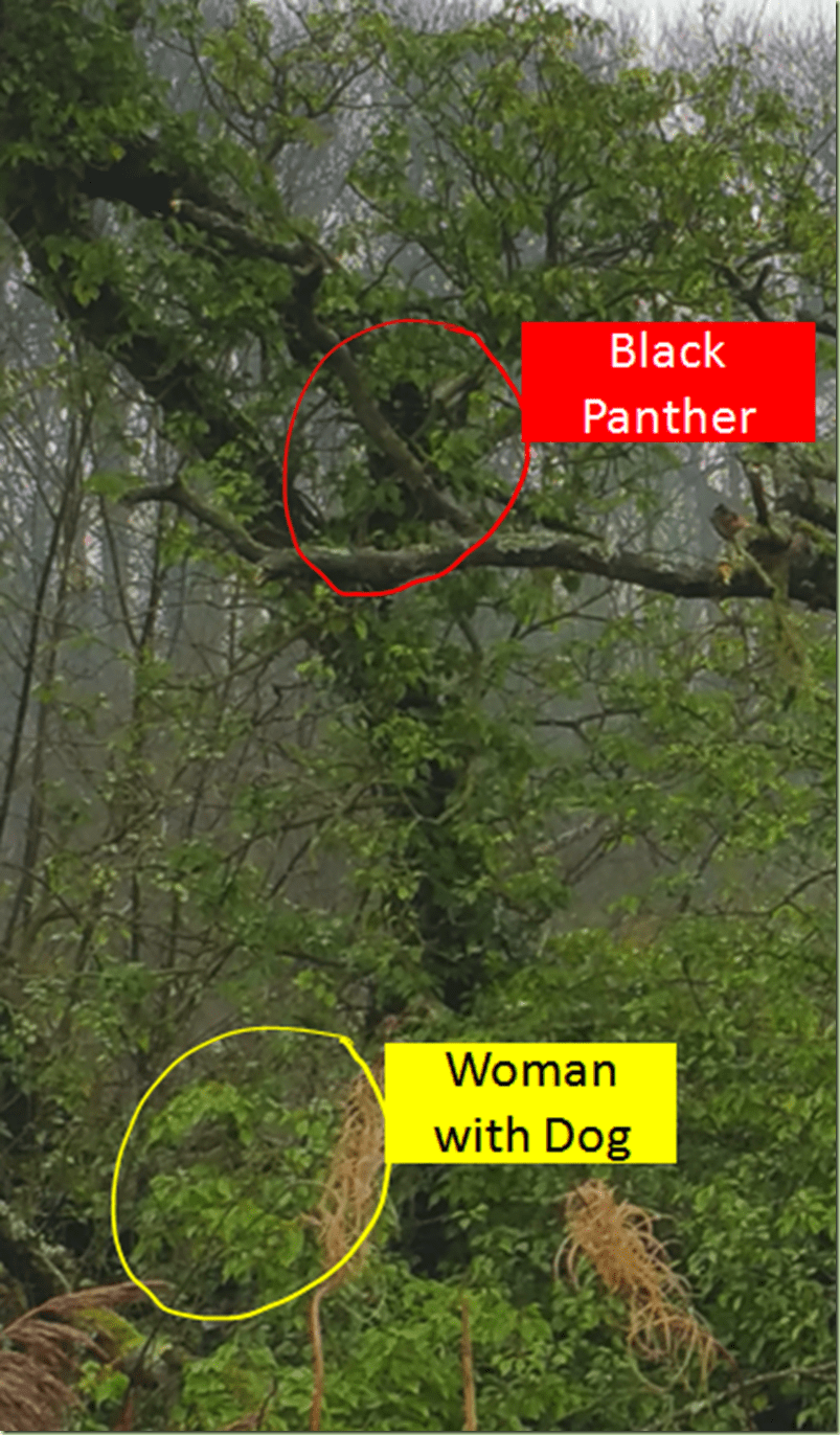 In yesterday’s post, I found myself wandering around the jungles of Cheshire, taking a photo or two of whatever it was that caught my eye. The photo I used, however, had a couple of extras that I didn’t see at first, although I’ll admit the Spirits of the Trees in this particular post were a little trickier than usual to see. I’ve highlighted them today. The Black Panther really stood out to me as he/she sat there in the branches of the tree, eyes glowing brightly with even its nose visible. And just as I was about to post my post, I spotted a woman in the bottom section. I didn’t spot her dog, which was pointed out by MrsCraft. I’ve use red for the panther and yellow for the woman to make them ‘clearer’, although the woman and her dog do take a little time to come into view. She’s holding a large Chihuhua Chiwowa Chihouha Chihohoa Chihouhaha Chihuhuhuha Chihuahua up in her arms, close to her face… if you make out either of their faces, you’ll soon see the other.