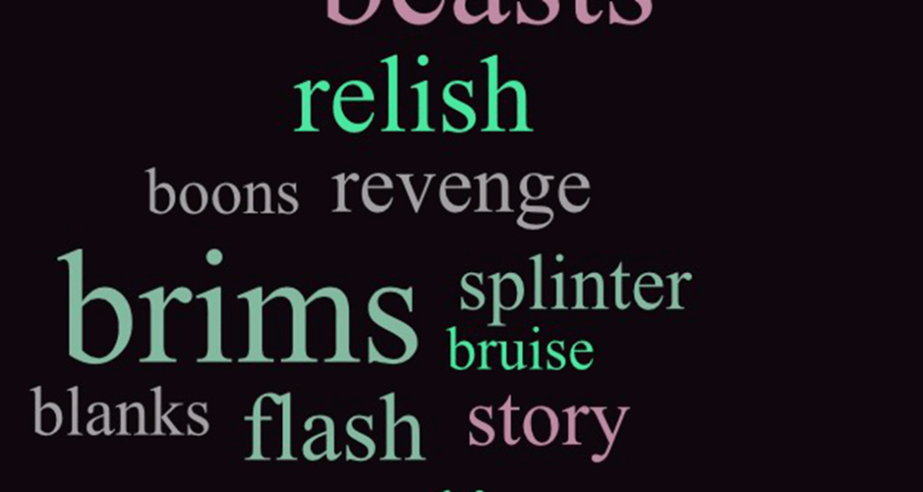 beasts/gargoyles; relish/dislike; boons/curse; revenge/grace; brims/inside; splinter/whole; bruise/fail; blanks/aware; flash/darkness; story/truth; peeling/cover; delusion/reality