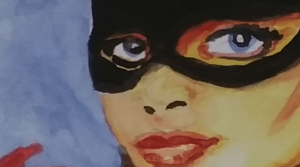 And my mind was made up. I was to paint yet another face, although one this time covered by a cowl. I had an issue with the nose, and I don’t think it looks particularly like Yvonne Craig, but my portraits of actual people tend not to look like who they are meant to be anyway. I’m getting around this one by saying it is a portrait of someone dressing up as Yvonne Craig dressed as Batgirl.