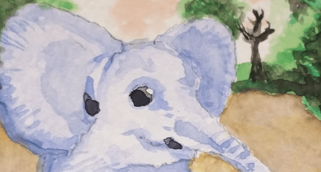 We’ve arrived at the watering hole on our safari now, and there’s a baby elephant cooling himself at the water’s edge.