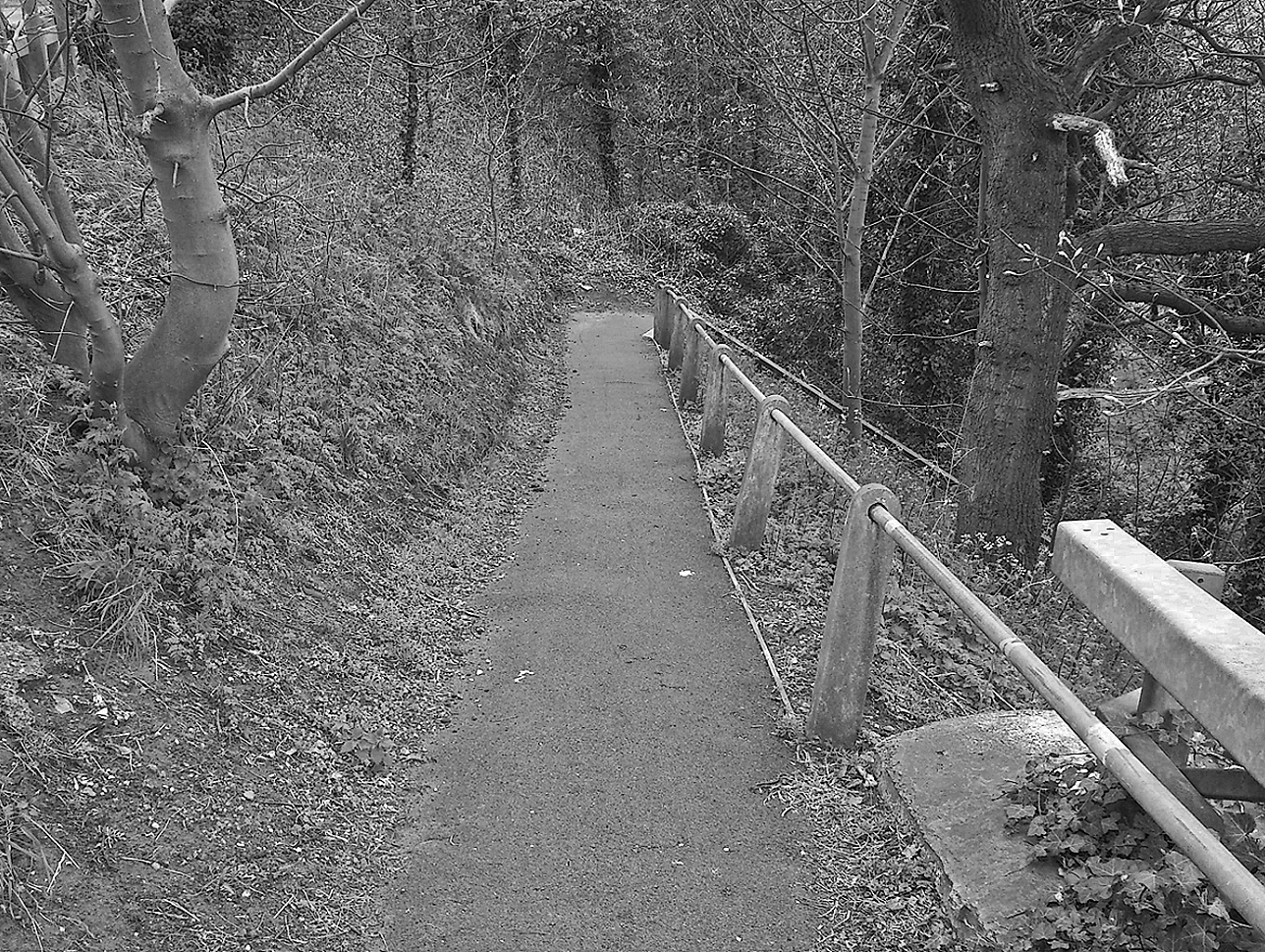 The path is actually sloping downwards, away from us, but at times it appears to be sloping downwards towards us. The only thing that corrects the view is the handrail on the second part of the path, after the turn.