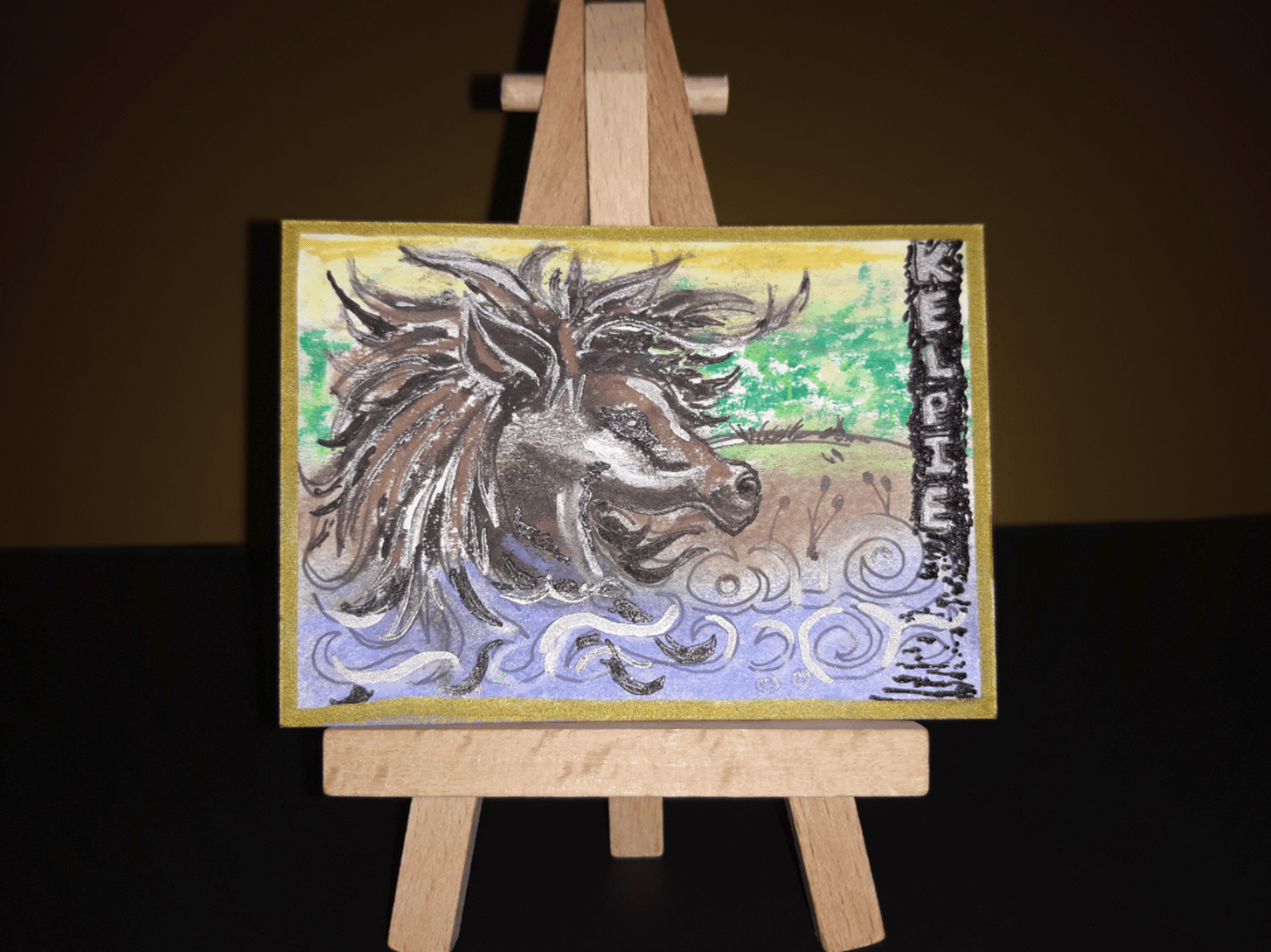 Created once again using pastels, gel pens and metallic markers, this was a rather quick ATC to create. My intention was to make the mane blend into the waves so the ‘horse’ became one with the water, but it would have become too dark, and the creature is already dark enough, I feel. Some of the gel pens have glitter in them, which really stands out on the kelpie’s eye, and I like how the face seems to have a wet look to it. Purely coincidental.
