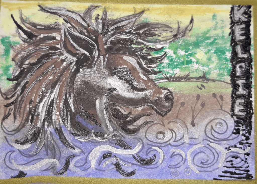This time we’re looking at the legend of the kelpie, a malevolent shape-shifting water spirit from Scottish folklore. They spend a lot of their time in or by rivers and streams, and usually take the shape of a tame horse or foal or pony. They do this to make themselves attractive to children, to encourage them to ride them – but this is where they turn sinister. Their coats are sticky, and whoever rides the kelpie cannot dismount. The kelpie then plunges beneath the surface of the water, and carries away its captive to be eaten at its leisure.