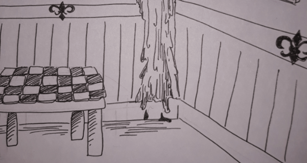 Out of the frying pan, into the fire. Maybe I should have stayed in that other room, the one with the huge spider-thingy that was emerging from behind the tall clock. In this room there’s some gloopy something-or-other running down the wall from a crack near to the ceiling, into the skirting board. Just there… nowhere else. And it seems incredibly sticky…