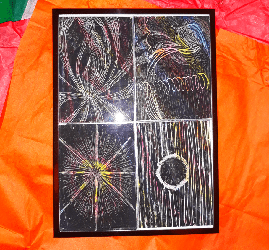 Now, the picture that Raili created was another surprise. As I was looking at each section in turn, I suddenly realised that I wasn’t looking at one picture, but four of them. Raili had created four ATCs and framed them. I’ve recently started creating ATCs (Artists Trading Cards) myself, so this made the gift even more special, even more personal, if you like.