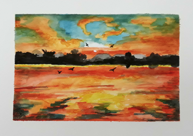And another hour goes by. And another day, according to my latest sploshing of colour for #WorldWatercolorMonth – my eighth now, in eight days! I think some of the blending of the colours in this attempt is OK, but some are shockingly terrible. The land on the horizon still needs work, and the clouds need touching up just a tad. The water looks like parched land – well, that’s how it looks around here at the moment – a little too solid for water, but I can live with that… even though it’s meant to be water. The seagulls indicate water is around somewhere – we can pretend we are out to sea looking into land, instead of looking across a wide bay somewhere.