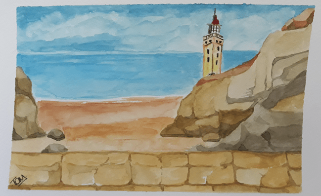 For this painting, my eleventh of eleven, if memory serves me right, is of a simple view out to sea. I found a lighthouse on th’internet and painted it into a scene from my imagination. I quite like how it turned out. Although I don’t like the wonky photo I’ve taken of it!