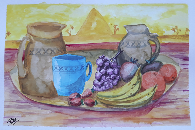 For today’s painting, I travelled all the way back to 1355BC and managed to paint this quick watercolour of a mid-afternoon snack before Queen Neferneferuaten Nefertiti (I was in luck as she’d just popped to the shops with her consort Pharaoh Akhenaten) returned to eat it.