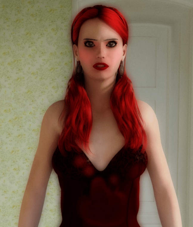 Flowing red hair, vibrant red lips and a slinky silky red dress did nothing to conceal the dark red stain evidently (and perhaps elegantly…) dripped down her front.