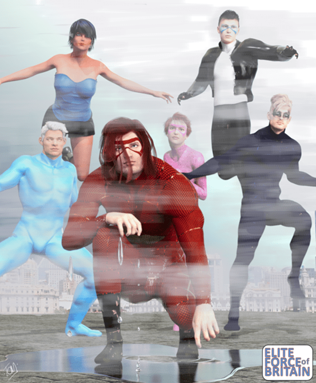 Muriel Magnificent flew in and knocked Matthew over to one side, stopping his watery blast. Firetop rolled to his side to catch his breath. Lycralad used his molecular altering abilities to fuse the leggings together of one of the stocky henchmen who carried a microwave out of one of the boats. The henchman fell forwards, flinging the microwave into the air. The Cloud swiftly leapt in and caught the microwave before it crashed to the ground. Bettystretch stretched her arms around five more of the henchmen and bound them together, although one slipped through her grip and plunged into the marina, as Betty misjudged the henchmen’s weight. Without a second thought, the Diver disappeared beneath the murky waters of the marina after the slippery henchman. Firetop sent a blast of flame across the path of another henchman who carried a jewellery box, in an attempt to stop him, but he just walked through it. Matthew sent a wave of water over to Muriel, who managed to fly above its path; the water instead knocking another henchman into the marina’s waters. Lycralad used his abilities again on another pair of henchmen, this time binding their arms to their sides, but a third henchman grabbed him from behind. The henchman shoved Lycralad forwards, and caught hold of both his ankles. He swung him around above his head, as if Lycralad weighed nothing. All the time he was striding forwards, and let Lycralad go as the Cloud stepped out from the boat where he had just returned the microwave. Lycralad bashed into the Cloud, knocking him down, but Lycra had managed to make himself weigh considerably less just a second before, so the Cloud was soon up again. Lycralad flew into the air. The Cloud managed to grab hold of a rope and wrap it around another henchman who had stepped on board the boat to retrieve some more booty. Bettystretch caught another henchman, and threw him on top of the others she was keeping pinned down by her elongated legs. Firetop used another of his blasts of fire to send another henchman into the water, who was swiftly scooped together with the other two by the Diver. He then leapt out of the water with the henchman to set them down dockside. Muriel Magnificent caught another henchman by his arm, but instead of turning him around, the arm came away in a burst of sparks.