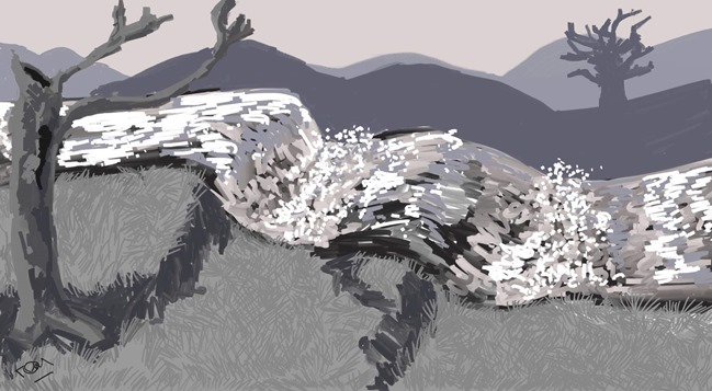 I’ve managed to get my tablet thingy working again, so have celebrated (and tested!) by creating this quick (just under an hour) scribbling that is meant to represent a cascade of water by an old tree. I created it in greyscale deliberately using a program called Corel Painter Essentials, with its ‘Wet Oily Blender’ function. I basically just scribbled and continued scribbling until I’d done enough. It’s fun where one’s imagination goes!