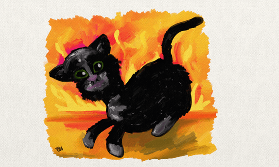 Poor Kitty! What happened to it??? When I first looked at it, you know how you can look at certain pictures and see one thing but if shown, you see another??? When I first looked at this I thought it was a picture of a charred kitty emerging from the flames behind him…I wonder where he has been? VK 🙂