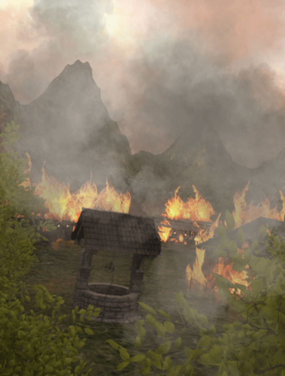 The bird didn’t stand a chance – Hunterre’s aim was perfect and the bird fell from the sky like a rock; landing on one of the rooftops, causing it to burst into flames, disrupting the usual peaceful harmony of the village. The fire quickly spread; soon the whole village was alight, causing the other villagers to frantically scurry around, saving what they could – although most was destroyed, including Hunterre’s reputation when he was renamed Gwylfryn Foolle, the village idiot.