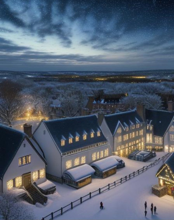 A snow-covered village scene, with a wintry view as far as the eye can see.